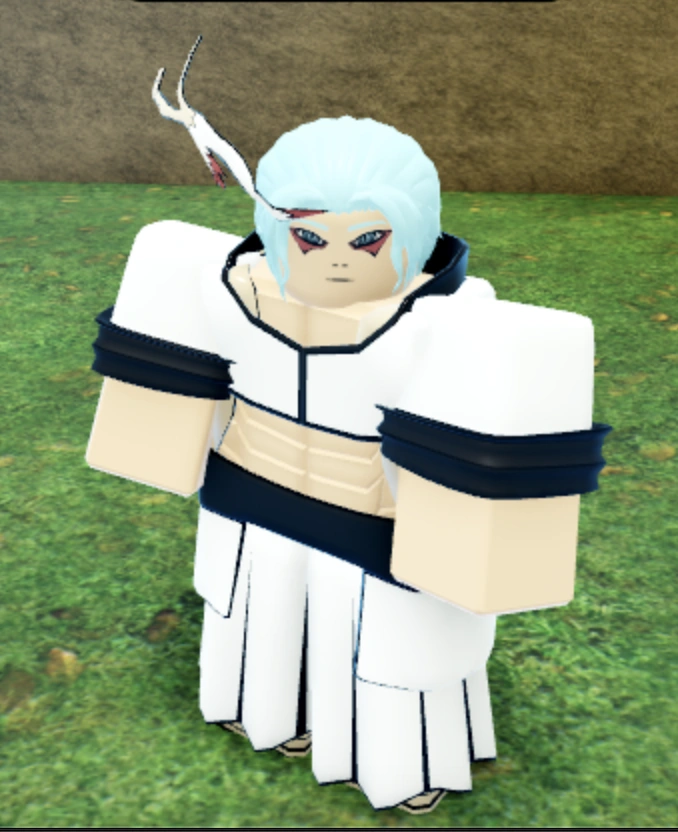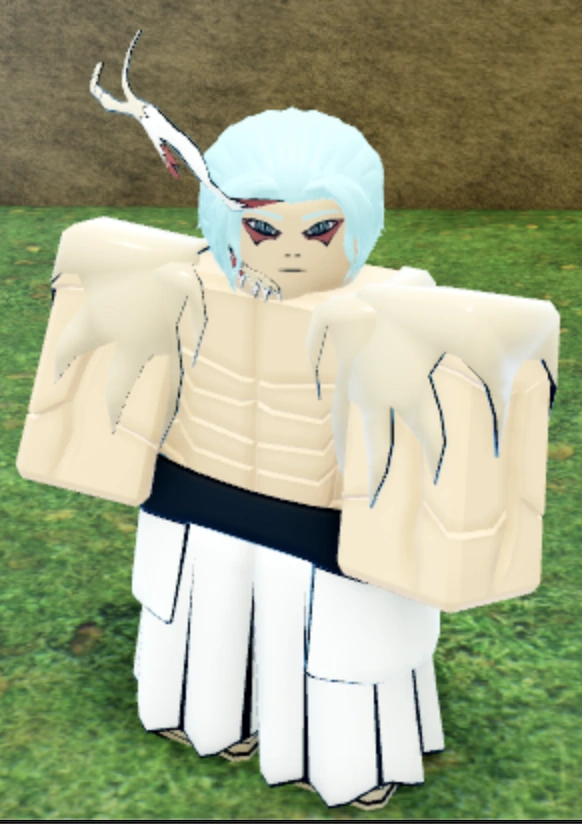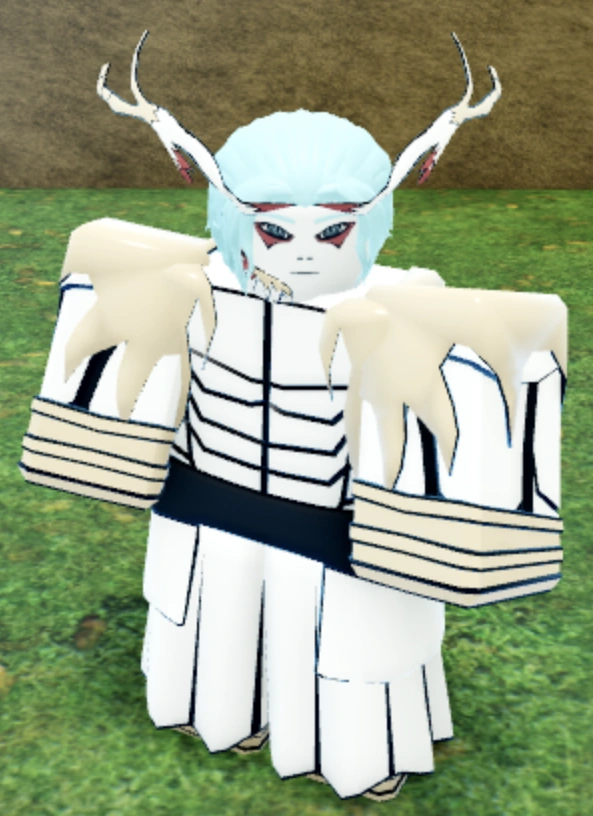 For Stage 1 of Mustang Spirit, the user dons a white jacket with black borders that covers their chest and shoulders and a pair of white leggings. The user grows a white antler on the right side of their head, and gains the Mustang Spirit's fur on the sides of their torso. They also gain blue eyes and red pigment under them, similar to the Mustang Spirit.
